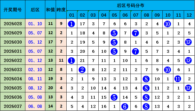 后区走势分析:上期开出06 08,开出和值14,较前一期和值上升1个点位变化,本期预测和值不变,参考号码06 08,和值14。